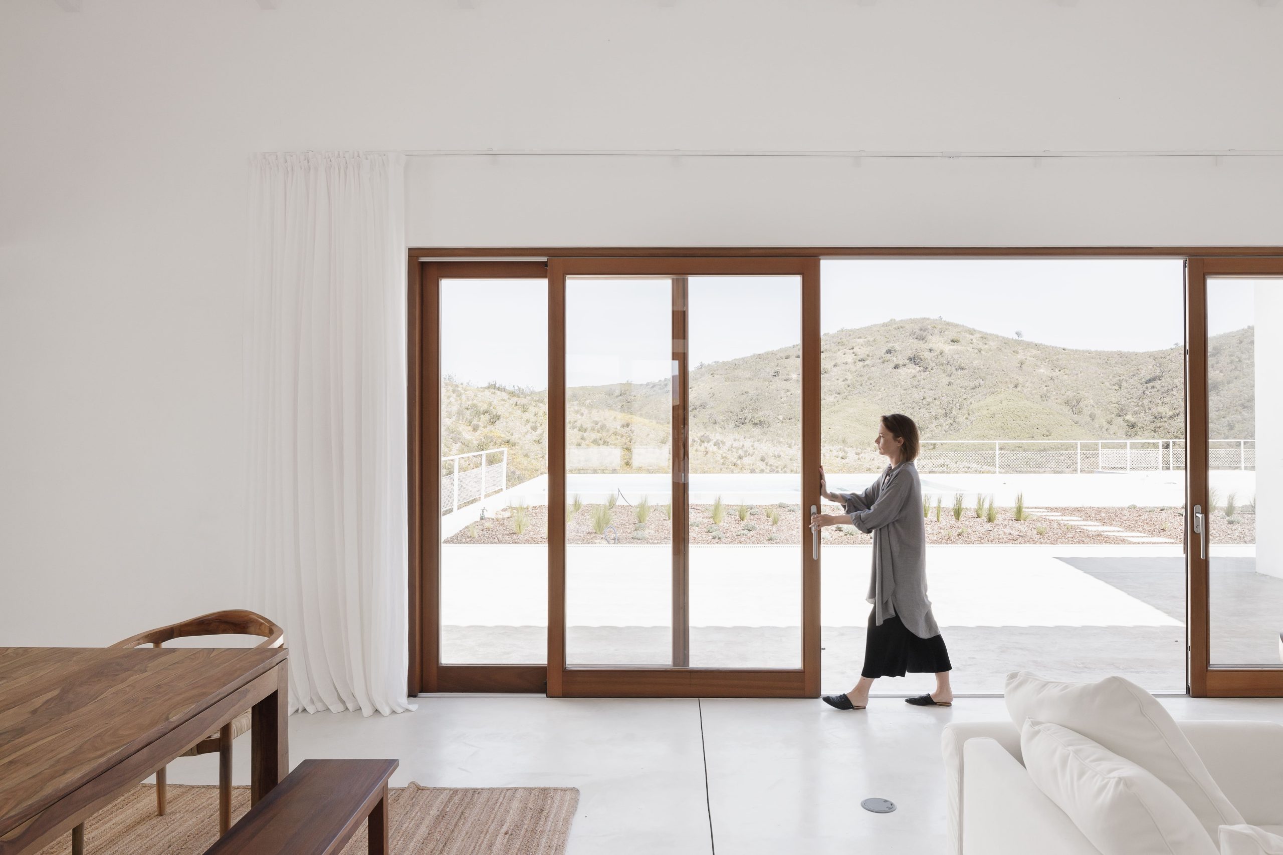 The building’s volumetry was designed to take advantage of the site’s topography, developing the house across two levels, with the difference in elevation carried through to the interior, creating two levels that articulate and separate the social and private areas.